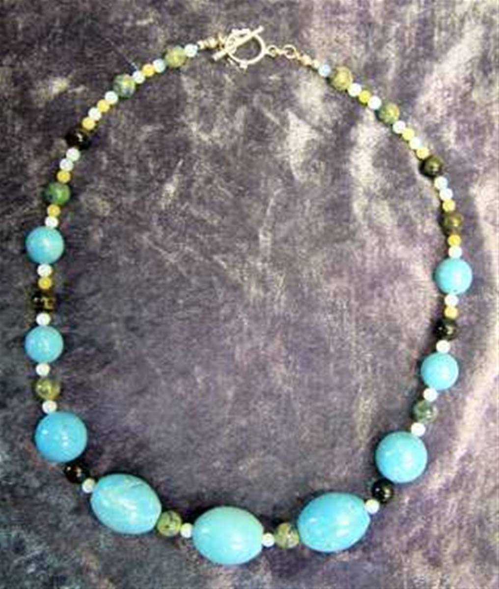 THIS NECKLACE FEATURES BEADS IN TURQUOISE, AZURITE, LIME JADE, OPALITE & BLUE TIGERSEYE.WEIGHT-72g.FEATURES A ‘T’ BAR STYLE CLASP IN STERLING SILVER.