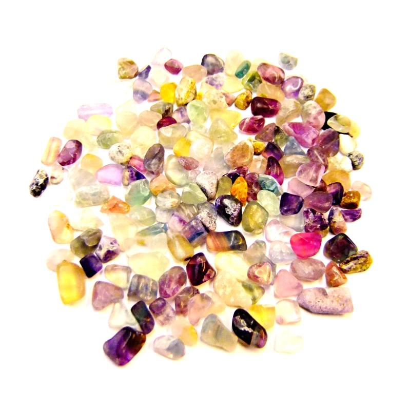 200g BAG OF FLUORITE POLISHED CRYSTAL CHIPS.