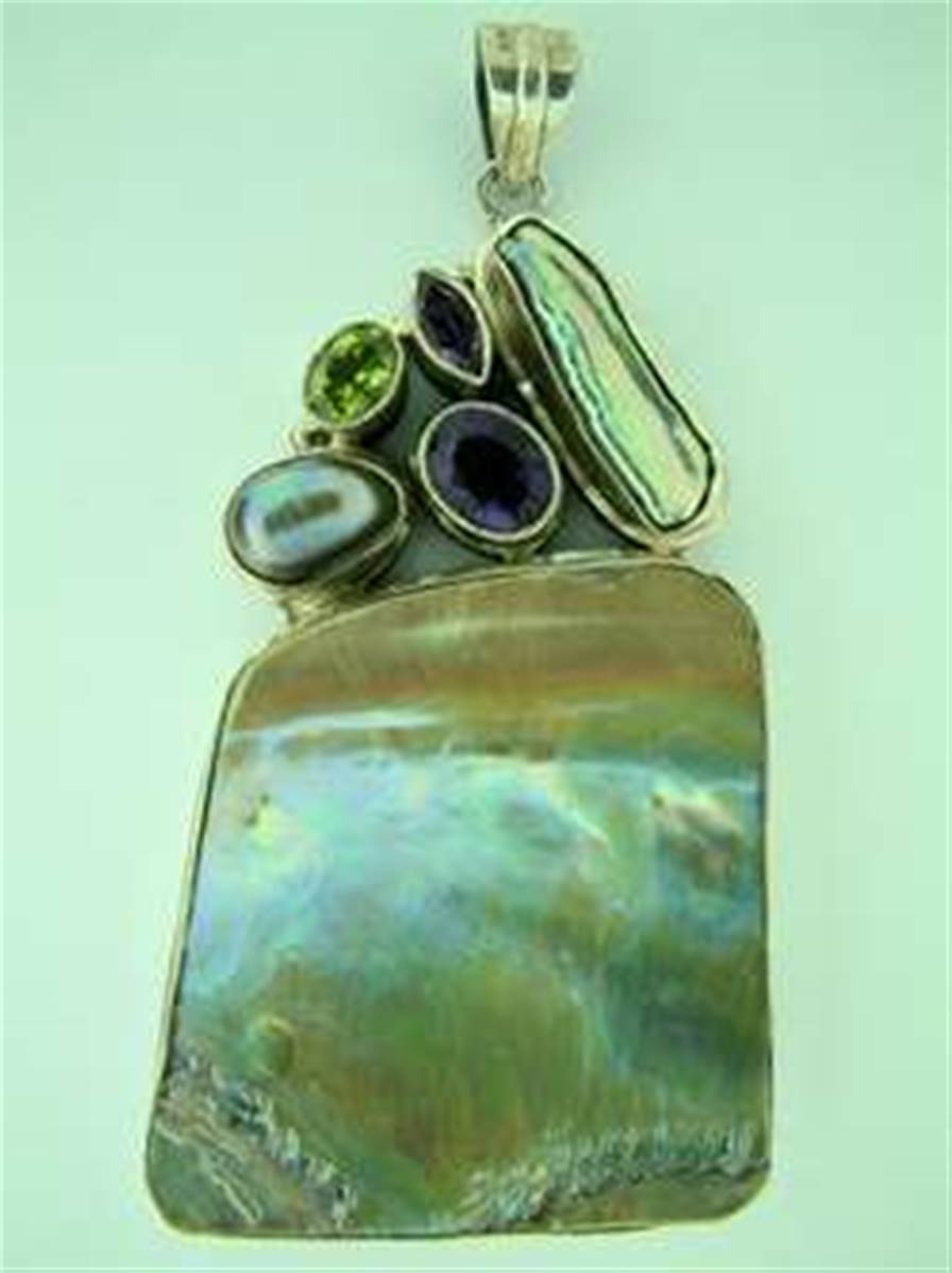 925 SILVER DESIGNER PENDANT FEATURING A STUNNING SECTION OF MOTHER OF PEARL & ALSO SET WITH FRESH WATER PEARL, FACETED AMETHYST & PERIDOT. LENGTH OF PENDANT = 83MM INCLUDING BAIL. WIDTH = 42MM. 40g.