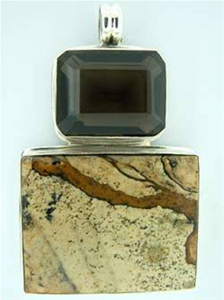925 SILVER DESIGNER PENDANT FEATURING A SQUARE CUT FACETED SMOKEY QUARTZ CABOCHON & LARGE SQUARE CUT CABOCHON IN POLISHED PICTURE JASPER. 60MM DROP INC BAIL x 37MM WIDE. SMOKEY QUARTZ CABOCHON SIZE = 22 x 17MM APROx. PICTURE JASPER = 35 x 28MM APROx. 30g.