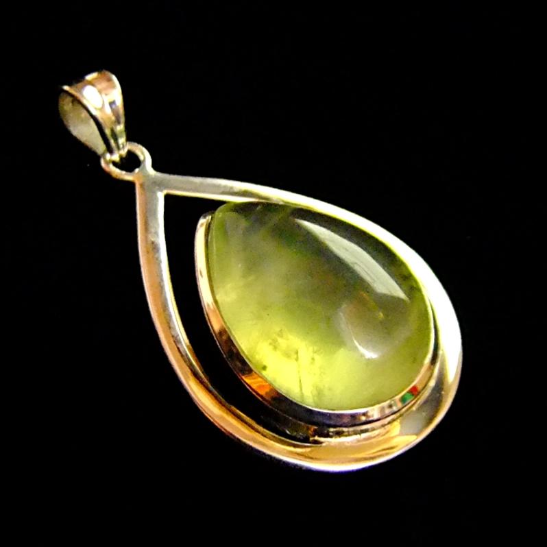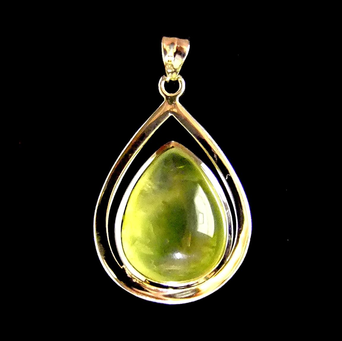 925 silver designer pendant featuring a single teardrop shape dome polished cabochon stone in prehnite. ,