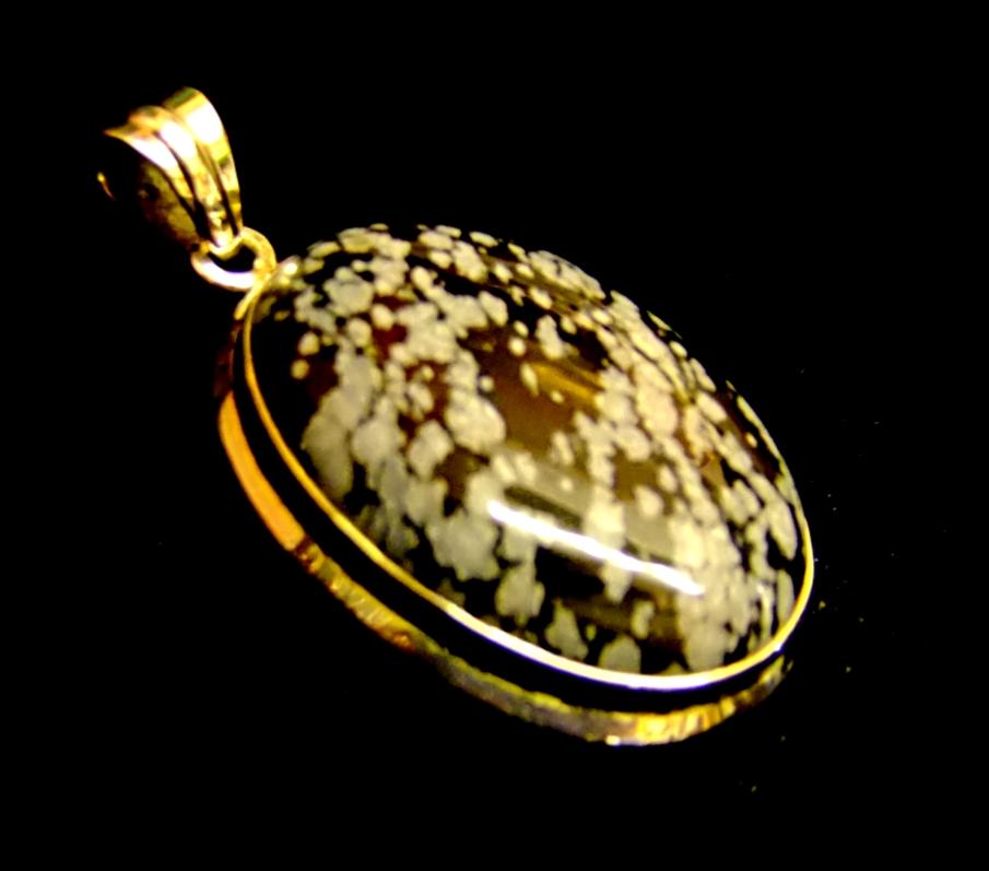 925 silver designer pendant featuring a large oval dome polished cabochon in snowflake obsidian.