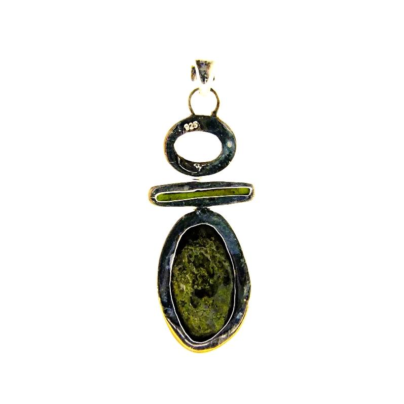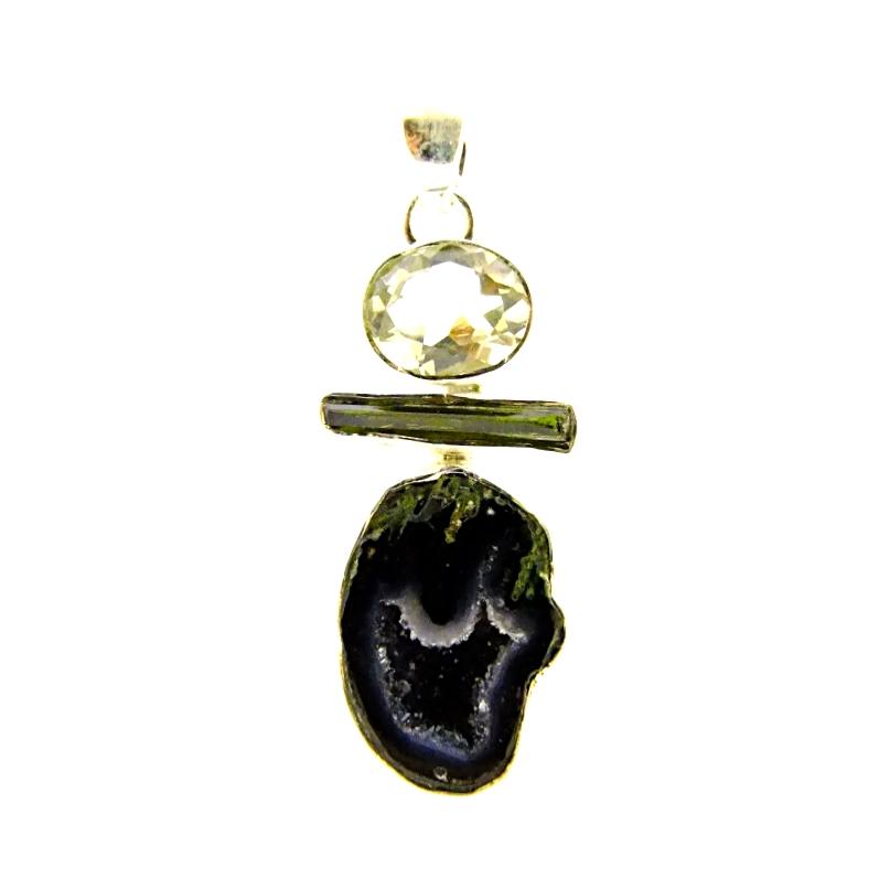 925 silver designer pendant featuring a polished face agate ocho slice together with a green tourmaline crystal &amp, faceted oval cabochon stone in prasiolite .