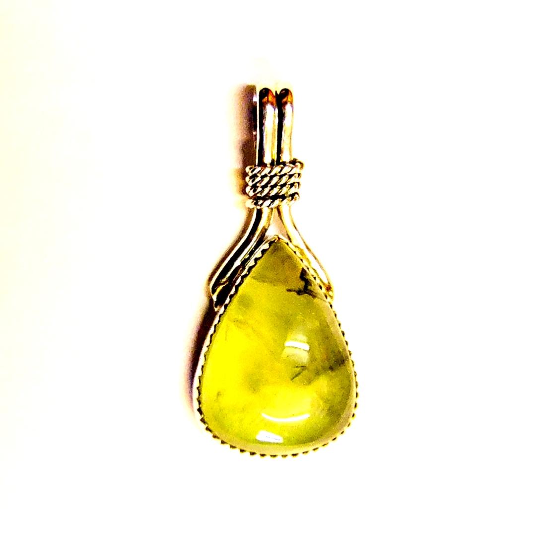 925 silver designer pendant featuring a single dome polished teardrop cabochon stone in epidot with prehnite. ,