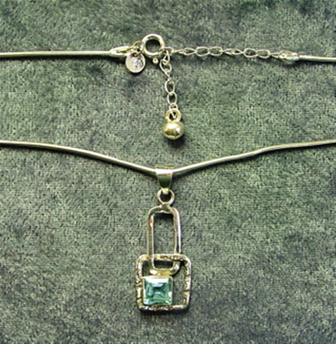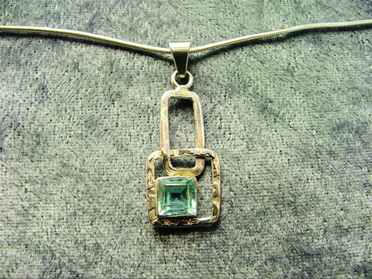 This pendant features a single faceted square cut cabochon in topaz on a 16″ snake chain with trigger style clasp.size of pendant = 39mm in length overall x 14mm wide aprox.WEIGHT Including chain = 5g.SIZE Of cabochon = 7mm x 7mm.