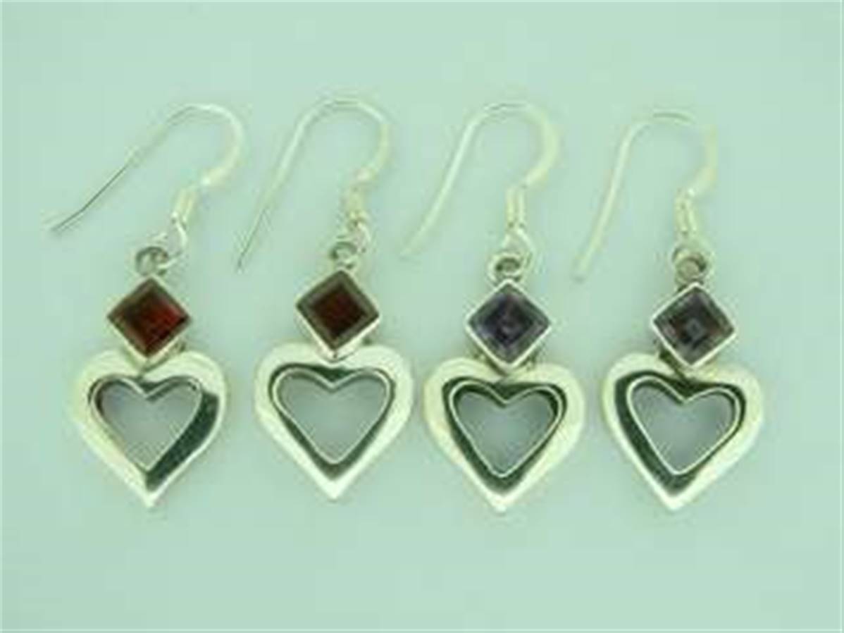 925 SILVER HEART SHAPE PENDANT EARRINGS FEATURING SQUARE FACETED CABOCHON IN GARNET. 35MM DROP x 13MM WIDE. CABOCHON SIZE= 5 x 5MM. 6g PAIR.