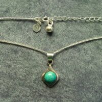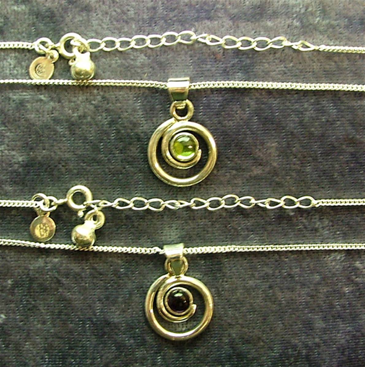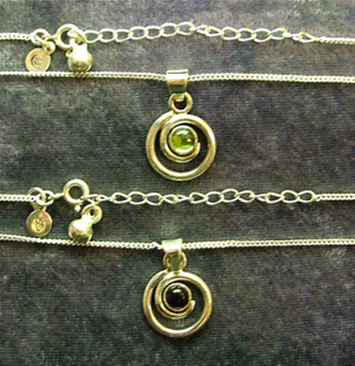 Pendant necklace featuring curb style chain & pendant in a spiral design with a single round cabochon in amethyst or peridot.chain length = 18″size of pendant = 23mm in length x 14mm wide aprox.SIZE Of cabochon = 5mm in diameter.chain has trigger style catch.weight = 5g.