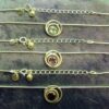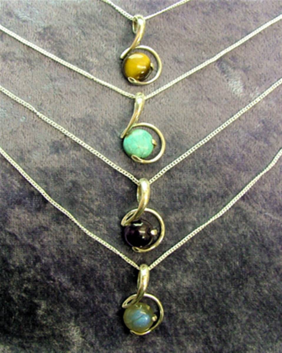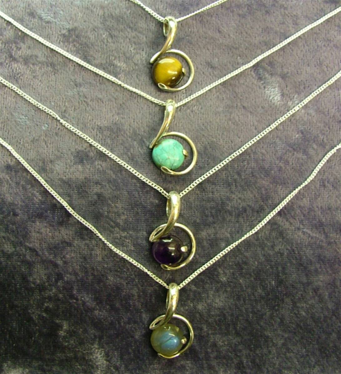 Pendant necklace featuring curb style chain & pendant in a swirl design with a single round cabochon in amethyst, turquoise or tigerseye.(LABRADORITE Sold out).CHAIN Length = 18″size of pendant = 25mm in length x 15mm wide aprox.SIZE Of cabochon = 10mm in diameter.chain has trigger style catch.weight = 8g.