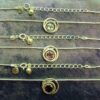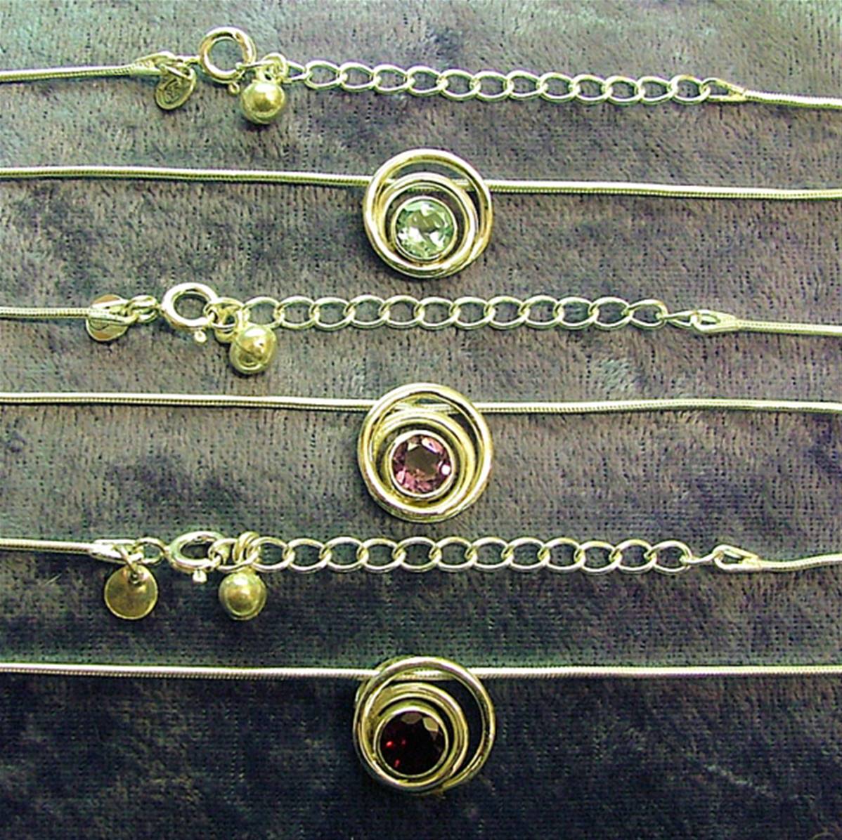 Pendant necklace featuring snake style chain & pendant in a spiral design with a single round faceted cabochon in blue topaz, amethyst or garnet.chain length = 18″size of pendant = 16mm in diameter aprox.SIZE Of cabochon = 7mm in diameter.chain has trigger style catch.weight = 8g.