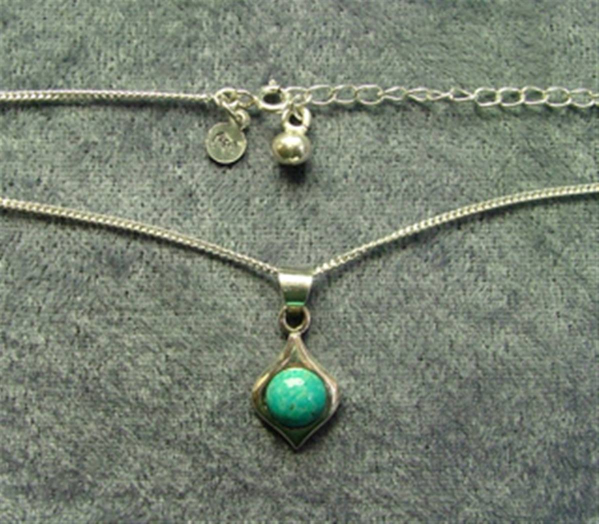 FEATURING A SINGLE ROUND DOME POLISHED CABOCHON IN TURQUOISE ON A 16″ CHAIN.SIZE OF PENDANT = 25MM IN LENGTH x 11MM WIDE APROx.SIZE OF CABOCHON = 8MM IN DIAMETER.WEIGHT 5g.