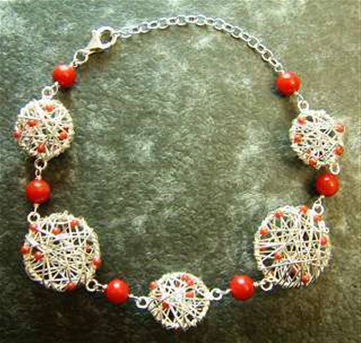 925 SILVER WIRE ‘BIRDS NEST’ STYLE BRACELET FEATURING BEADS IN RED CORAL WITH LOBSTER STYLE CLASP.BRACELET LENGHT-24CM x 19MM WIDE. 15g.