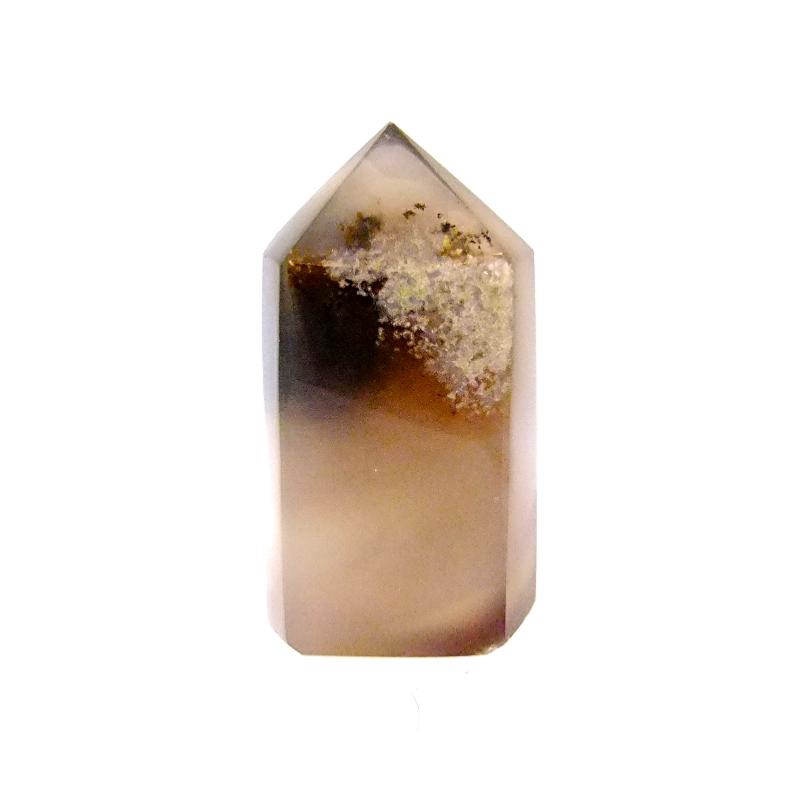 agate polished point specimen featuring white chalcedony druze &, flat cut base to stand.