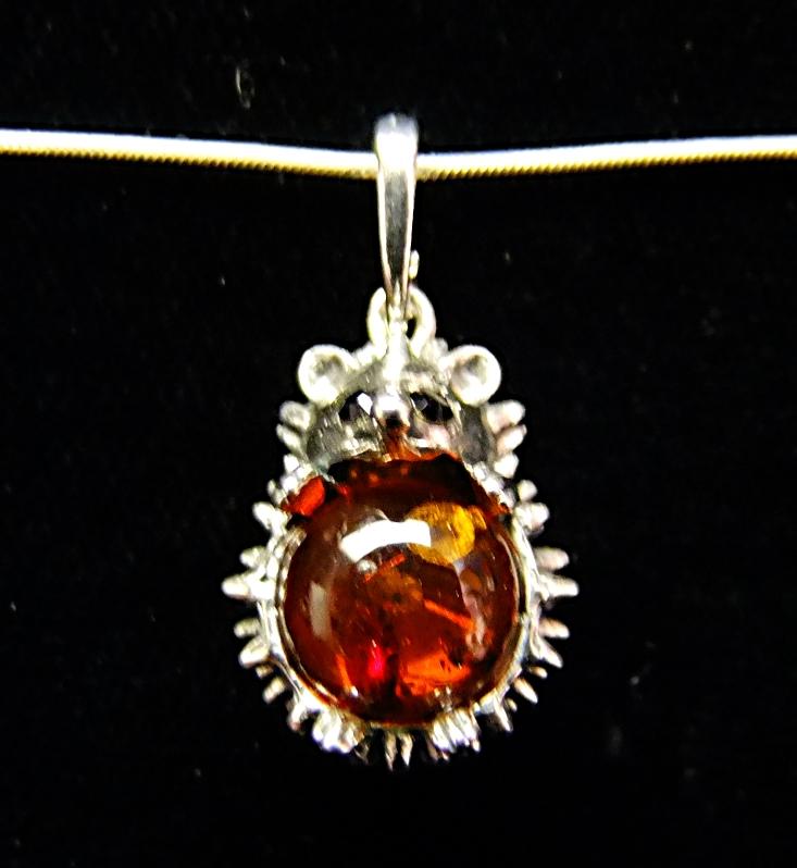 Hedgehog design necklace &, earring set in 925 silver featuring baltic amber .