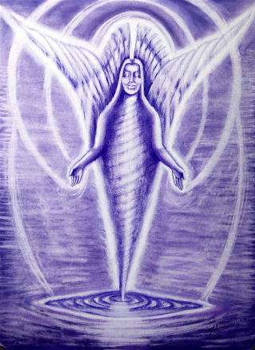 Amethyst Angel was inspired by the waveband of energy linked with intercessionary prayer. Geoffrey was trying to convey the concept of an Angel manifesting from a vortex of pure energy. The Being of Light arises from an ocean of compassion in order to answer humanities cries for help. The original 91cm x 70 was created on Ingres paper using pastels. A4 print with bevelled mount in textured ivory approx 41cm x 333cm.