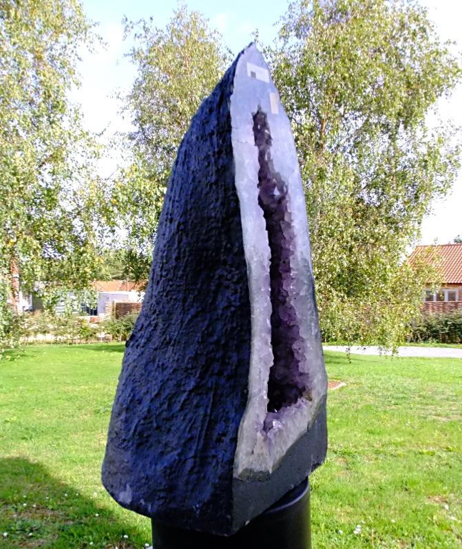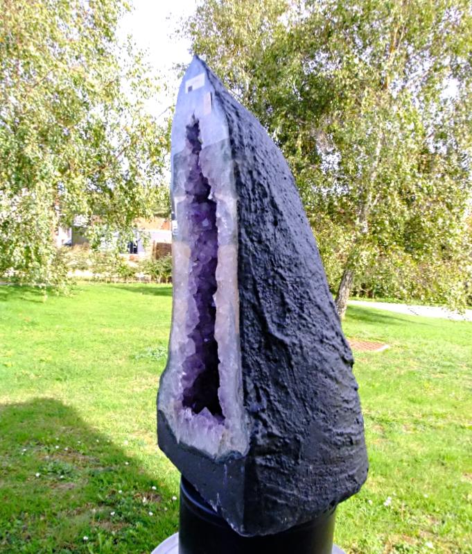 amethyst cave specimen featuring polished cut front face with flat base to stand.
