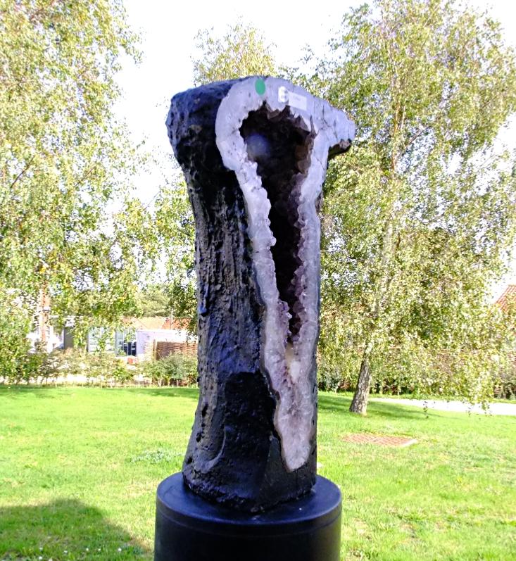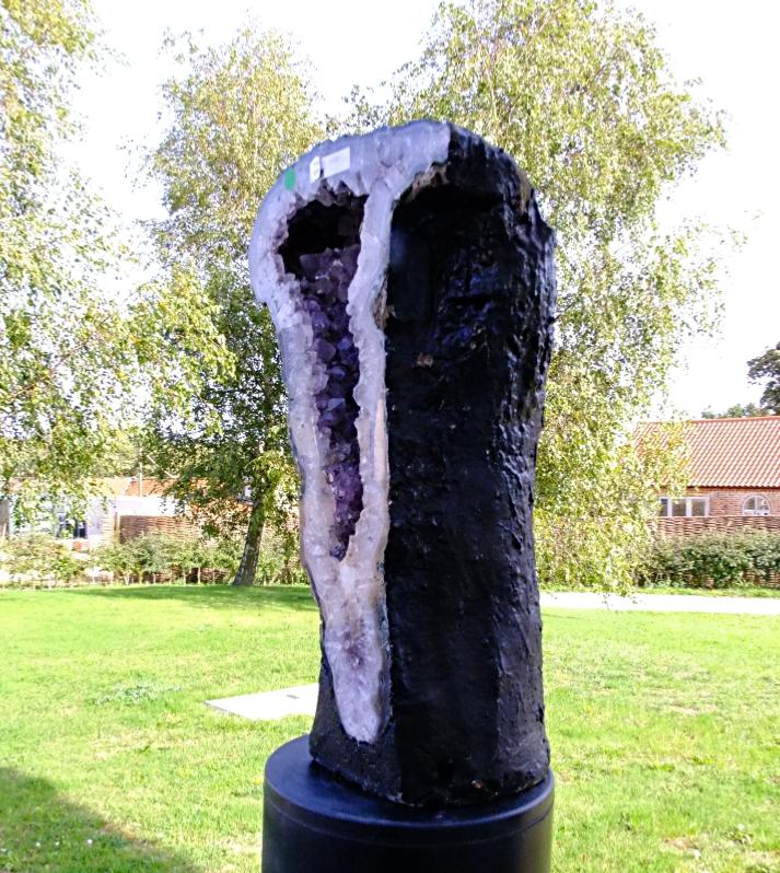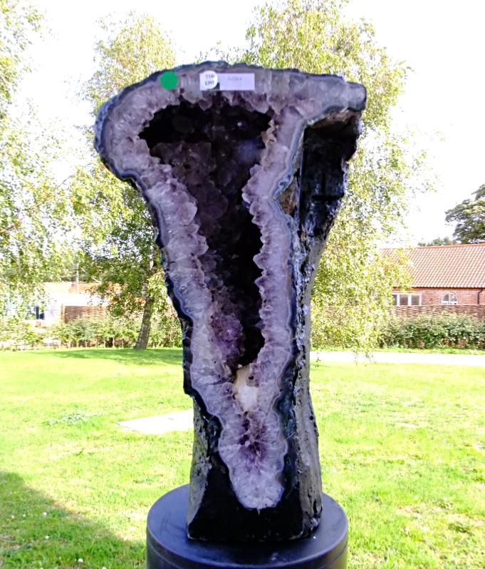 amethyst cave specimen featuring polished cut front face with flat base to stand.