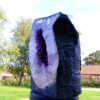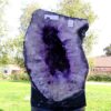amethyst cave specimen featuring polished cut front face with flat base to stand.
