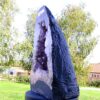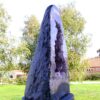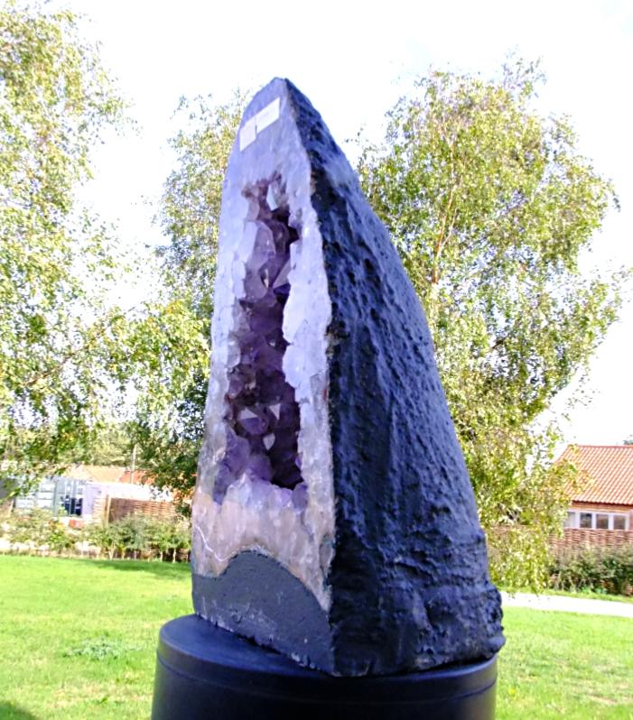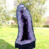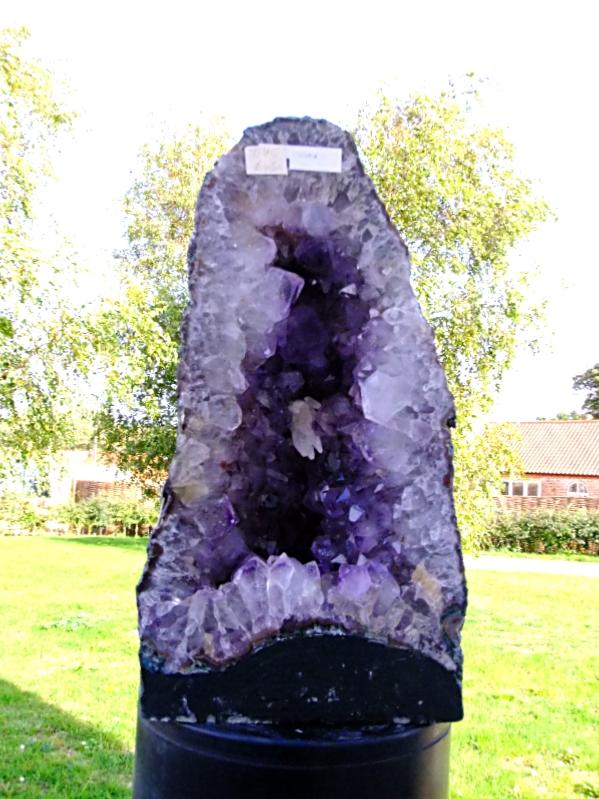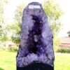 amethyst cave specimen featuring polished cut front face with flat base to stand.