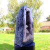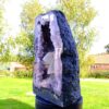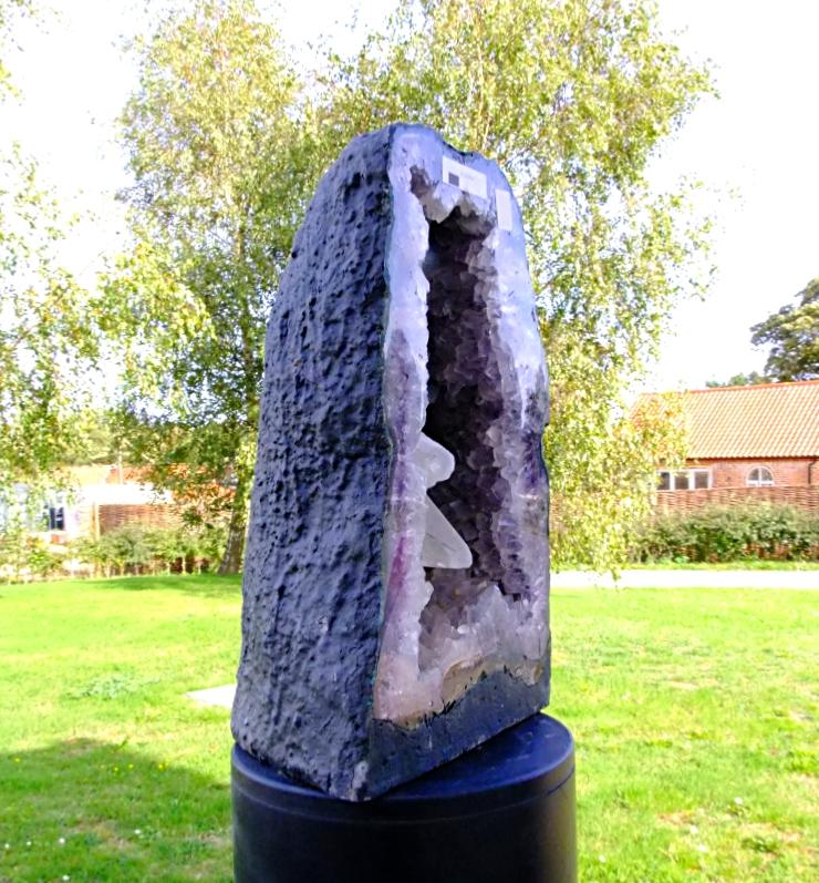 amethyst cave specimen featuring polished cut front face with flat base to stand.