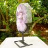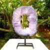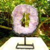 amethyst geode slice/ ring specimen featuring polished front &, rear cut faces, mounted on metal display stand.