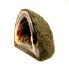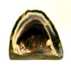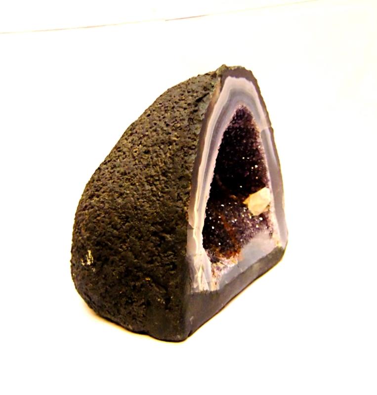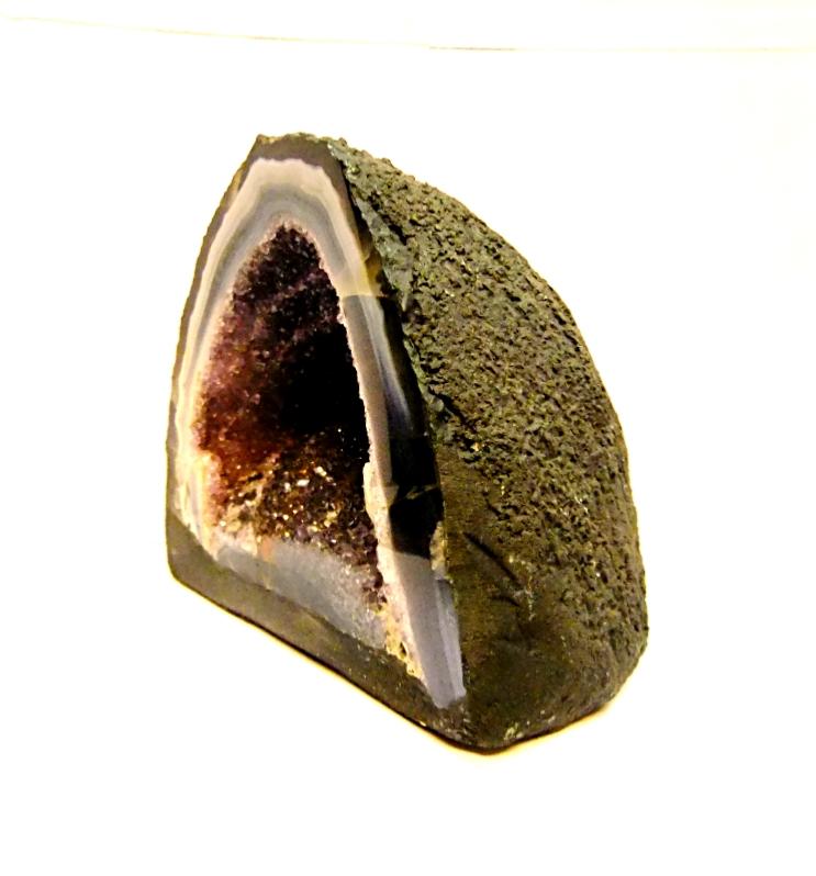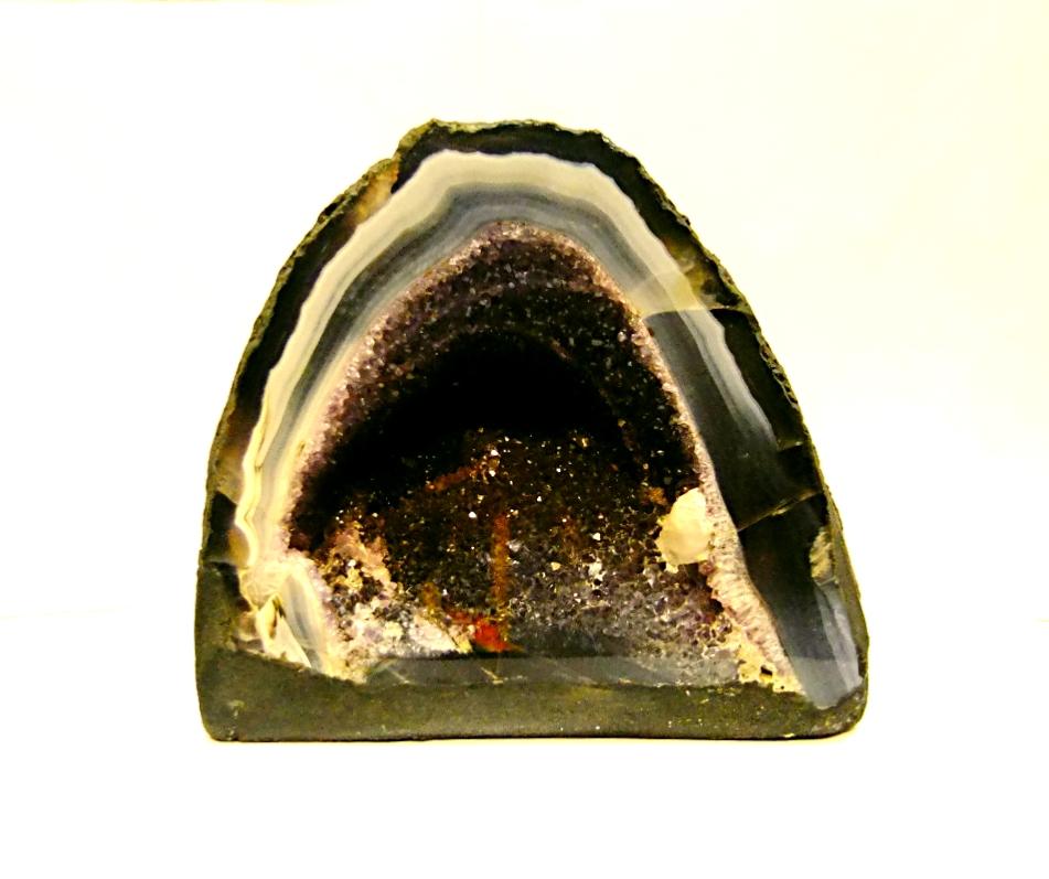 amethyst with agate mini cave specimen featuring polished cut front face &, flat base to stand, also features a small calcite crystal formation.