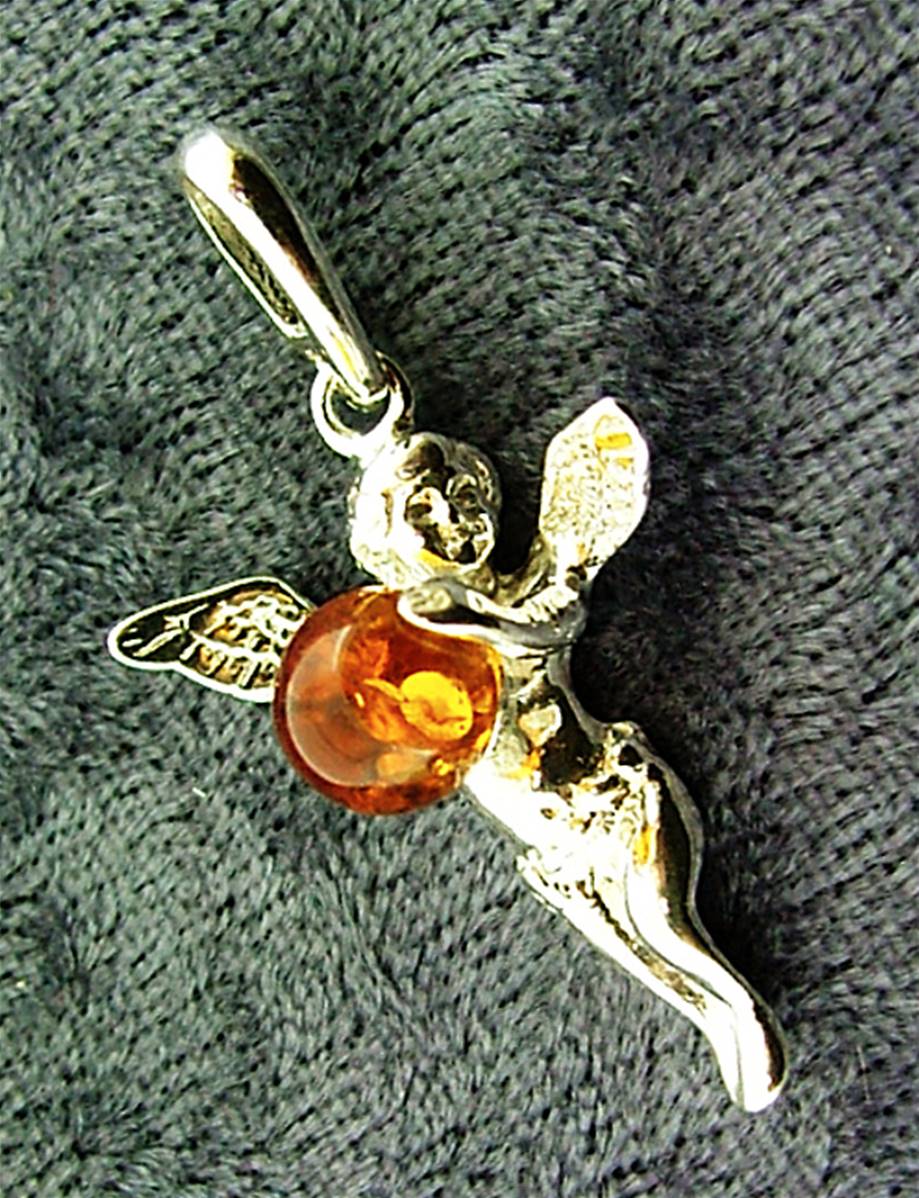With angel holding a sphere in baltic amber.size of pendant = 38mm in length x 20mm wide.weight = 4g.SIZE Of chabochon = 7mm in diameter.