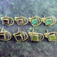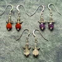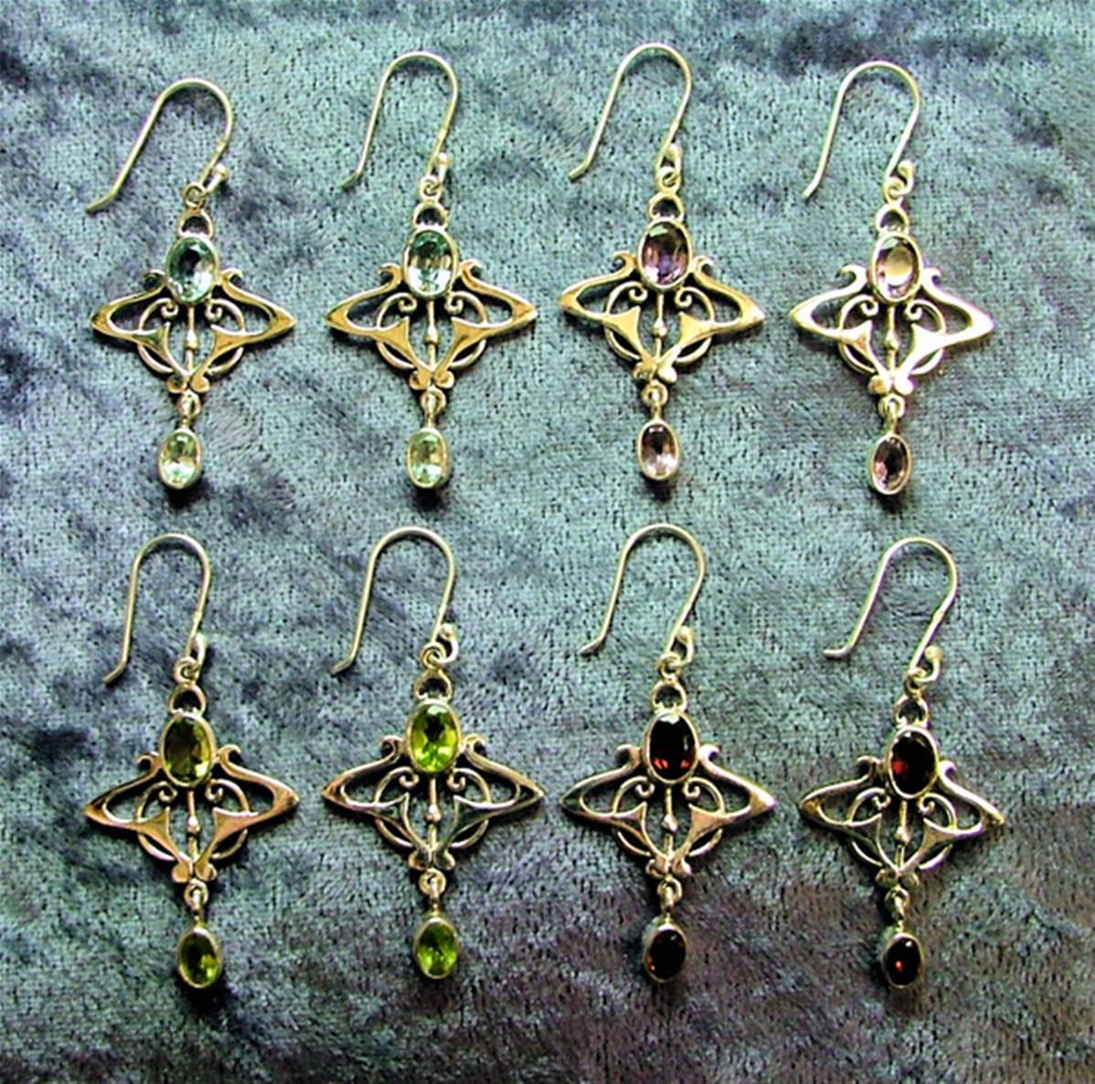 These earrings feature two faceted oval shape cabochons available in blue topaz, amethyst, peridot & garnet.size of earrings = 50mm in length including earwire x 23mm wide.size of cabochons = 7mm x 5mm & 6mm x 4mm.weight per pair = 6g.