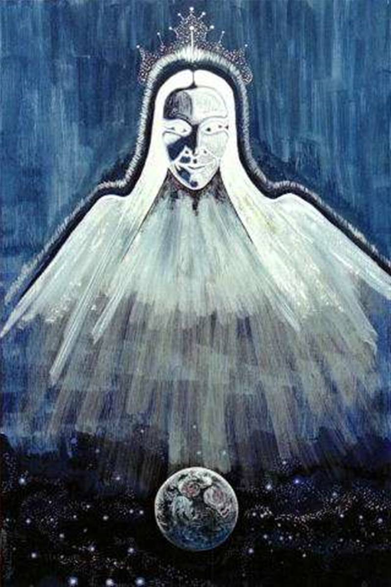 Angel of Light Geoffrey had a vision of this entity twenty five years ago after leading a peace meditation. It subsequently became his guardian angel and he has worked with the being ever since on an intercessionary basis to bring healing and peace into the world. The original 47cm x 30cm was painted on wood using gouache. A4 print with bevelled mount in textured ivory approx 41cm x 33cm.