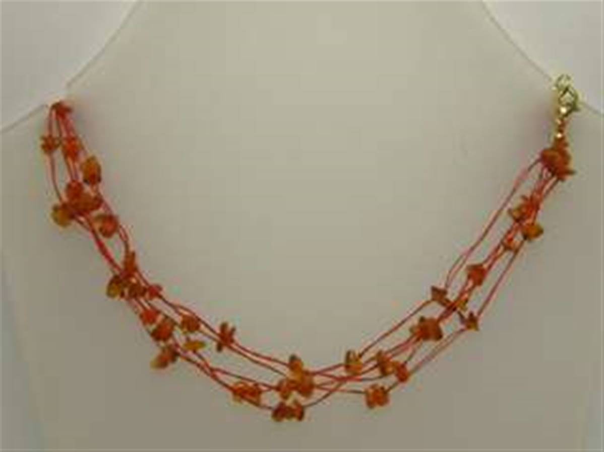 CARNELIAN THREADED GEM CHIP NECKLACE. 18″ LONG. 12g. FEATURING A GOLD PLATED LOBSTER STYLE CLASP.