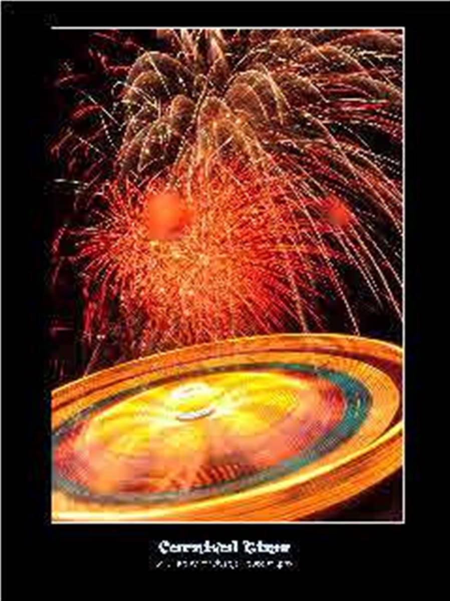 Taken on carnival night on a long exposure, fireworks fill the air as the daring ride on fairground rides and spots of rain distort the lens.Professionally printed on 10.6x14cm art/post card with description and watermarked monochrome image on the reverse.