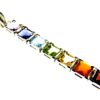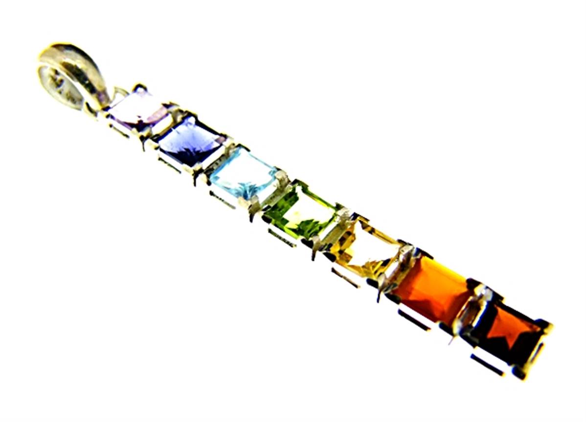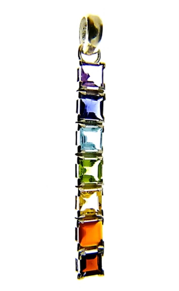 Chakra pendant in 925 silver.features facetted square cut cabochons in amethyst, iolite, blue topaz, peridot, citrine, garnet & carnelian.pendant size = 59mm in length x 6mm wide aprox.WEIGHT = 5g.SIZE Of cabochons = 5mm x 5mm.