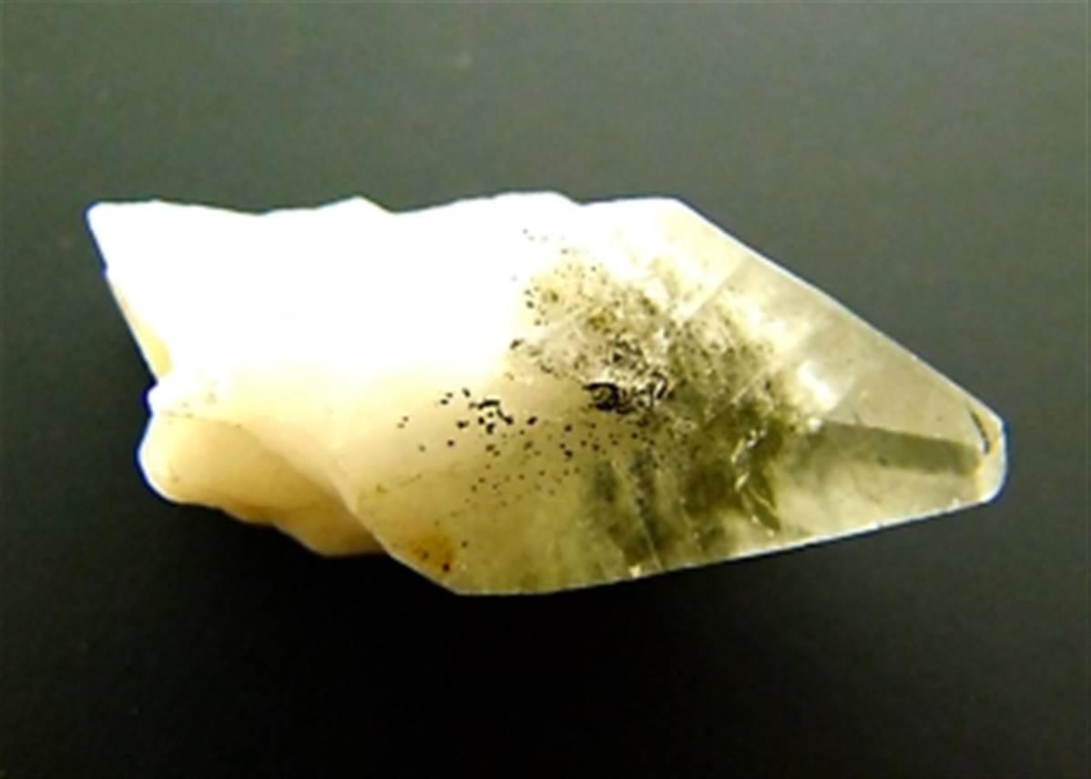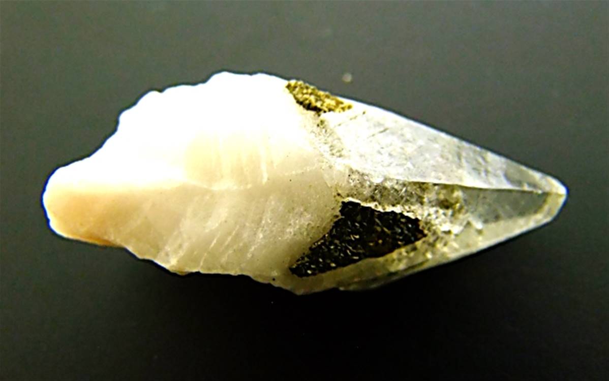 Chalco-pyrite in calcite crystal tip.size = 45mm in length x 19mm x 15mm aprox.WEIGHT = 15g.