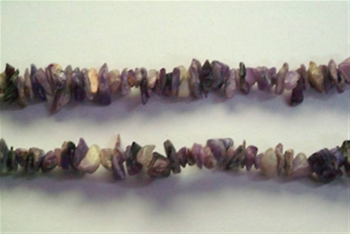 CHAROITE GEM CHIP NECKLACE FEATURING A GOLD PLATED LOBSTER STYLE CLASP. 18″ LONG