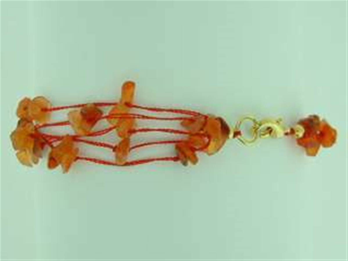 COTTON THREADED GEM CHIP BRACELET IN CARNELIAN. FEATURING A GOLD PLATED LOBSTER STYLE CLASP.BRACELET LENGTH = 7.5″. WEIGHT = 6g.