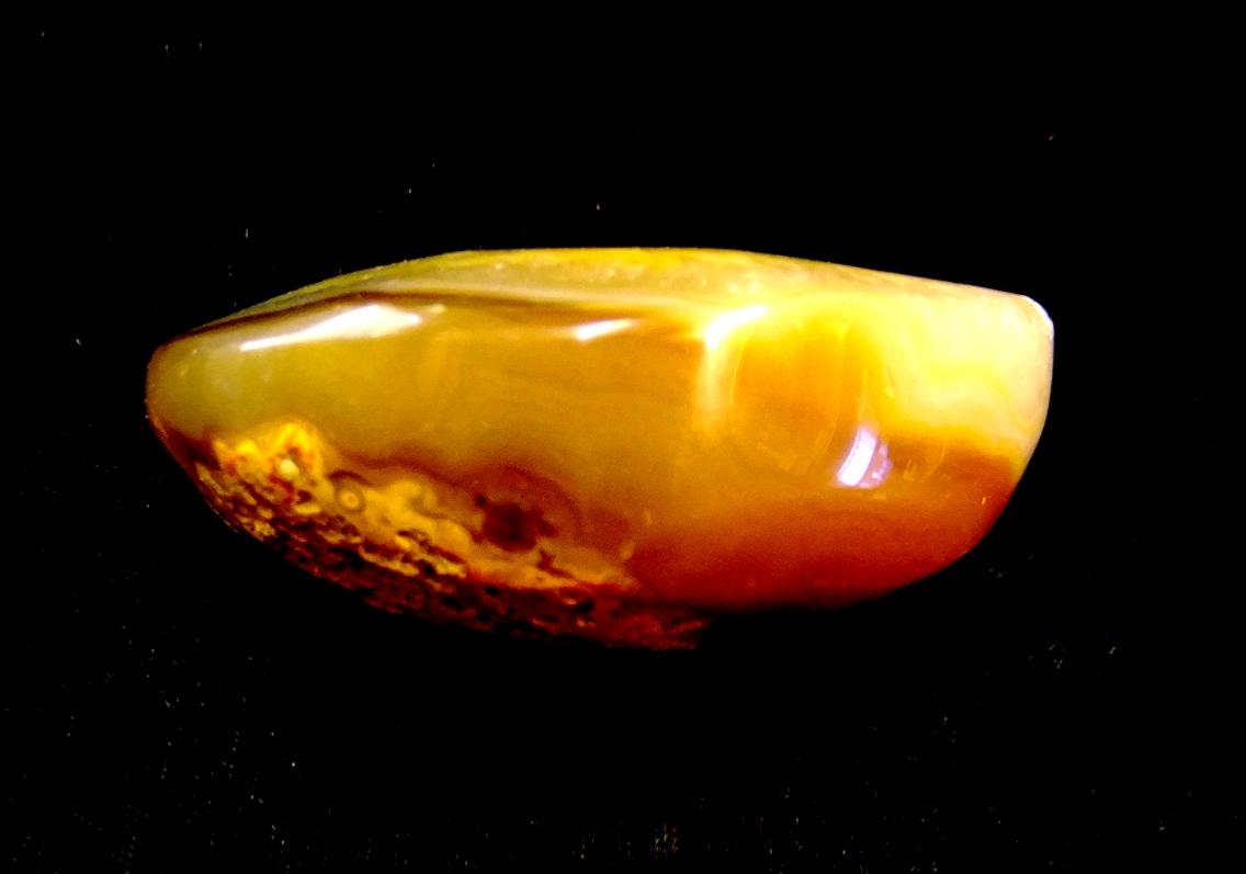 Crescent moon carving in agate featuring druze formations on one size and flat base on the other.