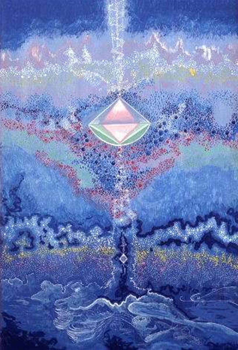 Diamond Descending was inspired by galvanic changes in the artist’s life. He was moved to paint the sense of solitariness experienced by the spiritual aspirant when embarking on a difficult path when everything is cut to the bone and one is exposed to the true nature of being. The original 46cm x 31cm was created on wood using gouache. A4 print with bevelled mount in textured ivory approx 41cm x 33 cm.