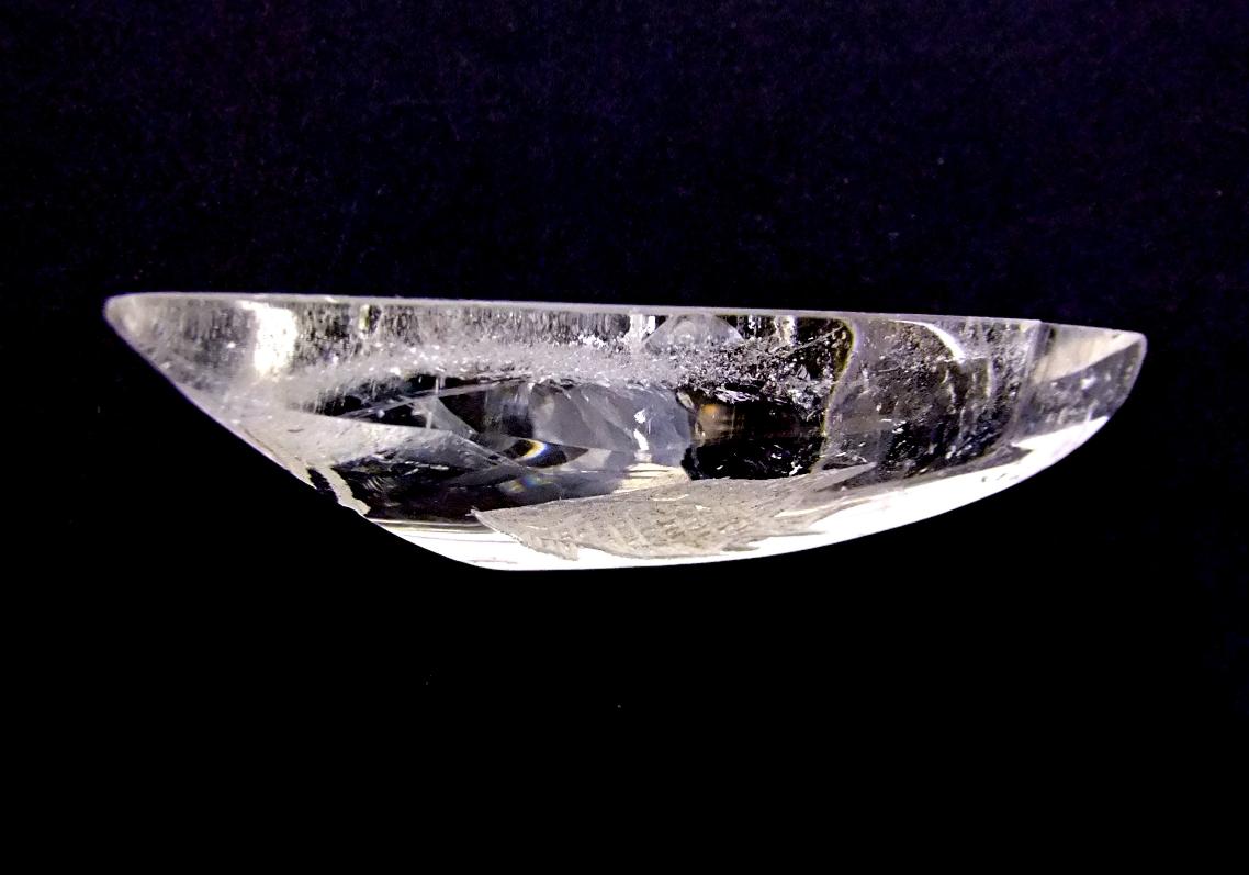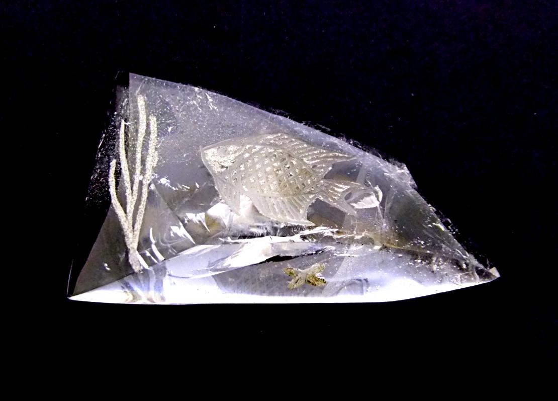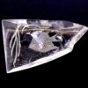 engraved quartz polished ‘free form’ crystal specimen features picture of a fish on one side with flat cut base to stand.