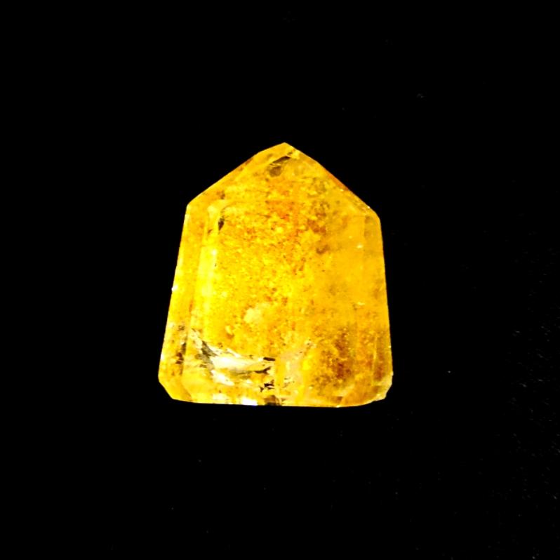 golden quartz polished point specimen features flat cut base to stand.