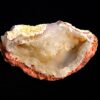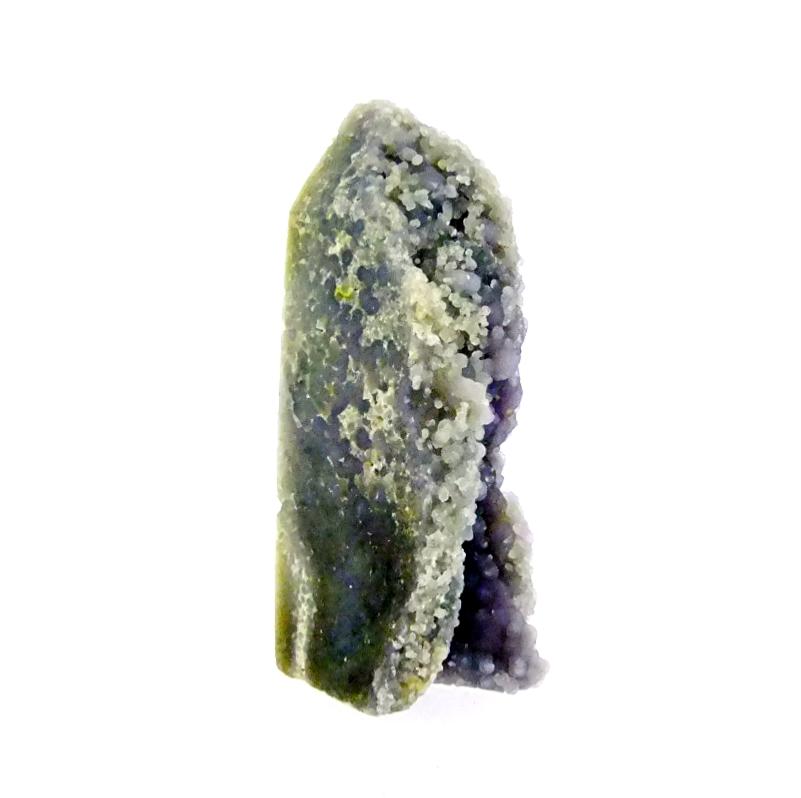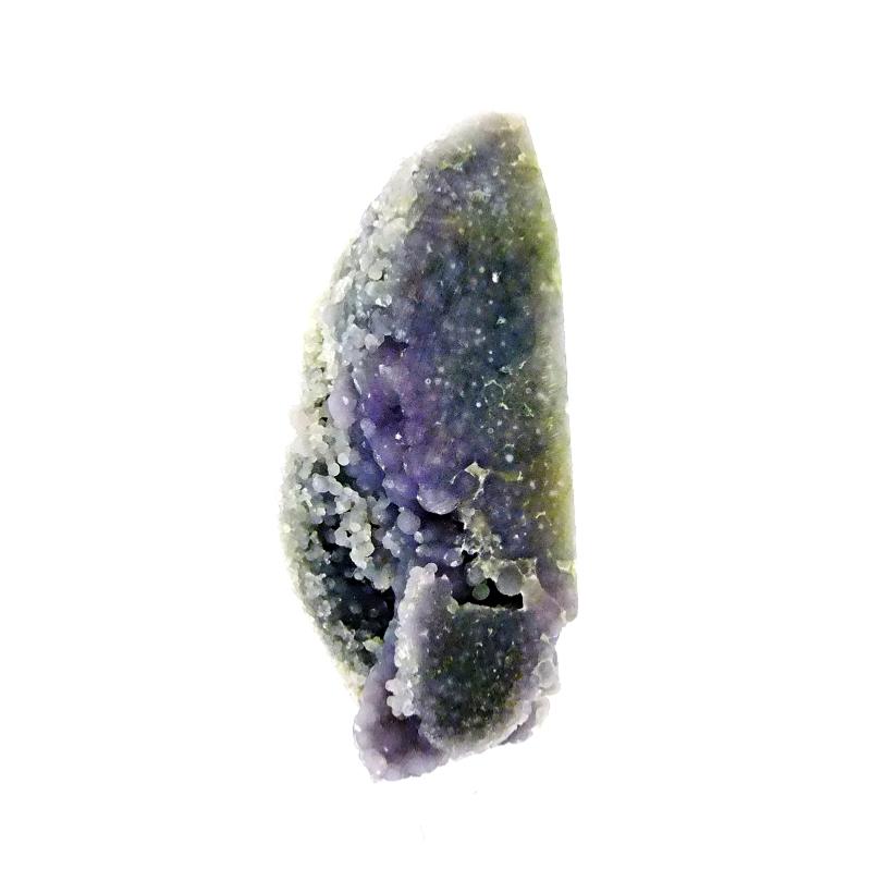 grape chalcedony crystal specimen featuring cut unpolished sides and back.