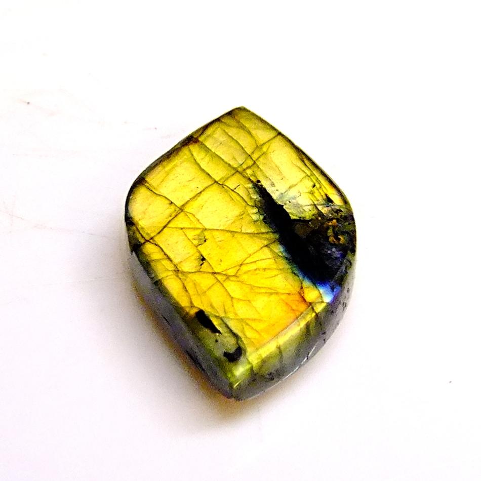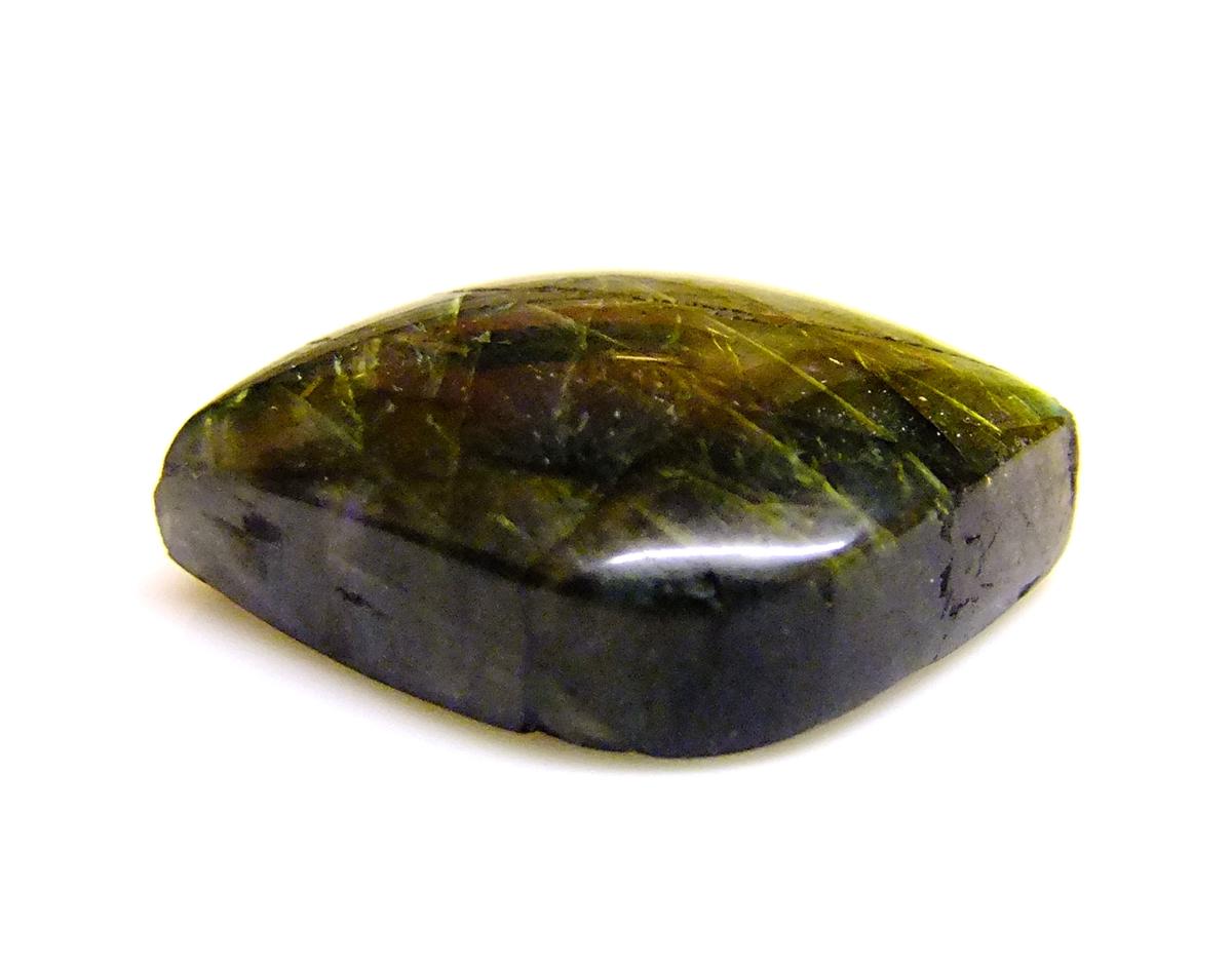 labradorite polished cabochon stone in cats eye shape, one dome polished face with flat cut back face.