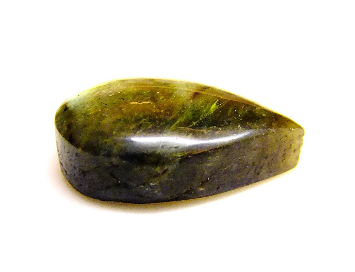 labradorite polished cabochon stone in teardrop shape, one dome polished face with flat cut back face.