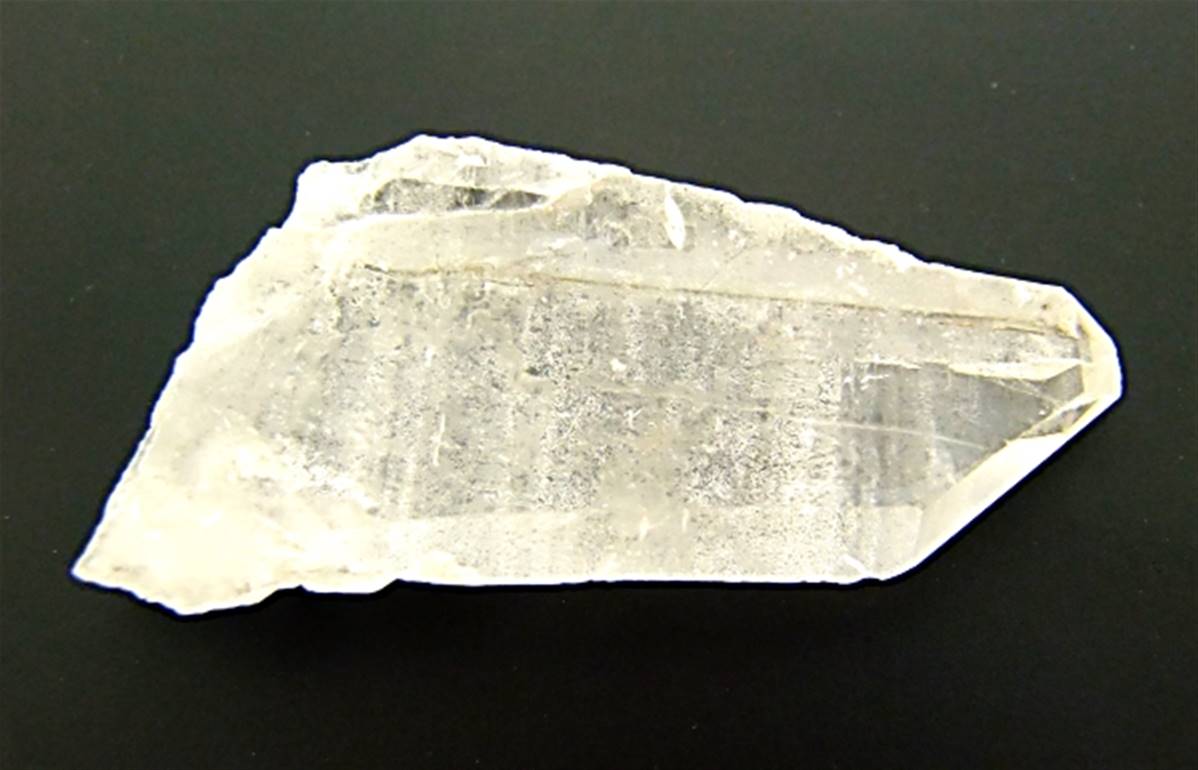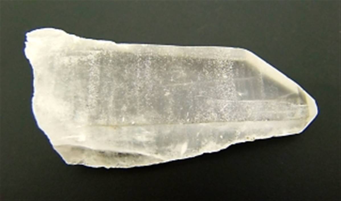 Laser quartz point specimen. Point features barnicle formations, frosted etched surface, (tabby or tabular-flat crystals having notches on one side or other or both, some are double terminated).SIZE = 78mm in length x 35mm x 15mm aprox.WEIGHT = 55g.