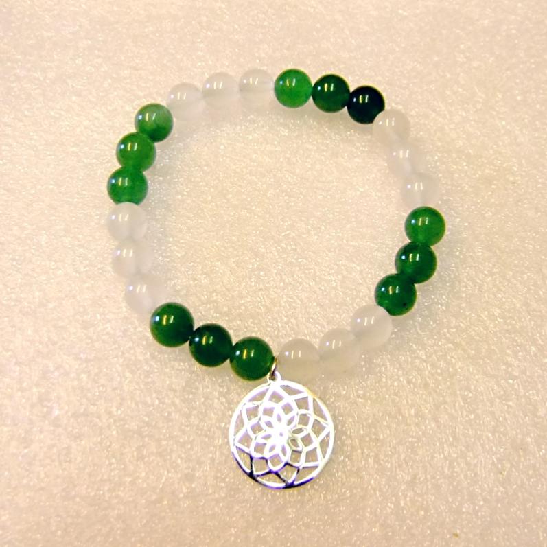 Mandala Charm Power Bead Bracelet with Green Amazonite ,&, Quartz Beads. ,