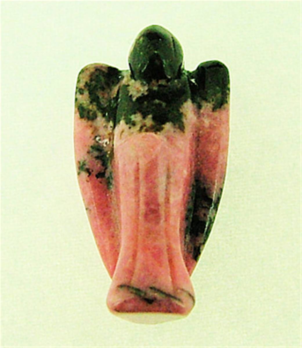 MINI ANGEL CARVING IN RHODONITE.SIZE = 2.5CM TALL x 1.5CM WIDE x 1CM DEEP APROx.WEIGHT = 10g.