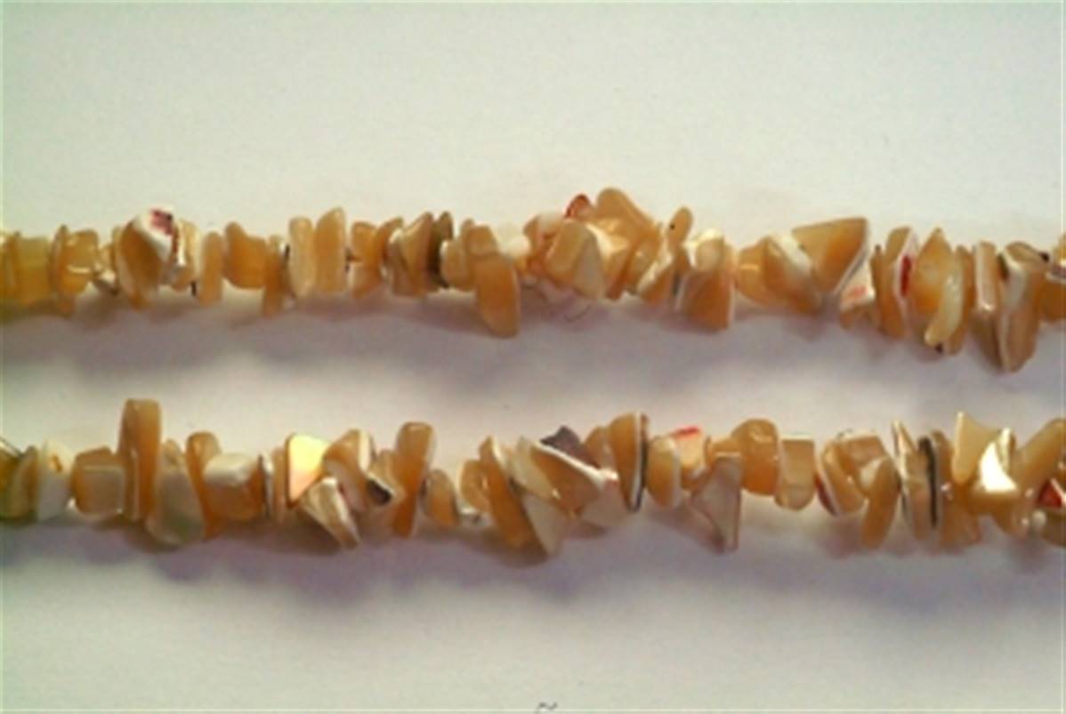 MOTHER OF PEARL GEM CHIP NECKLACE FEATURING A GOLD PLATED LOBSTER STYLE CLASP. 18″ LONG