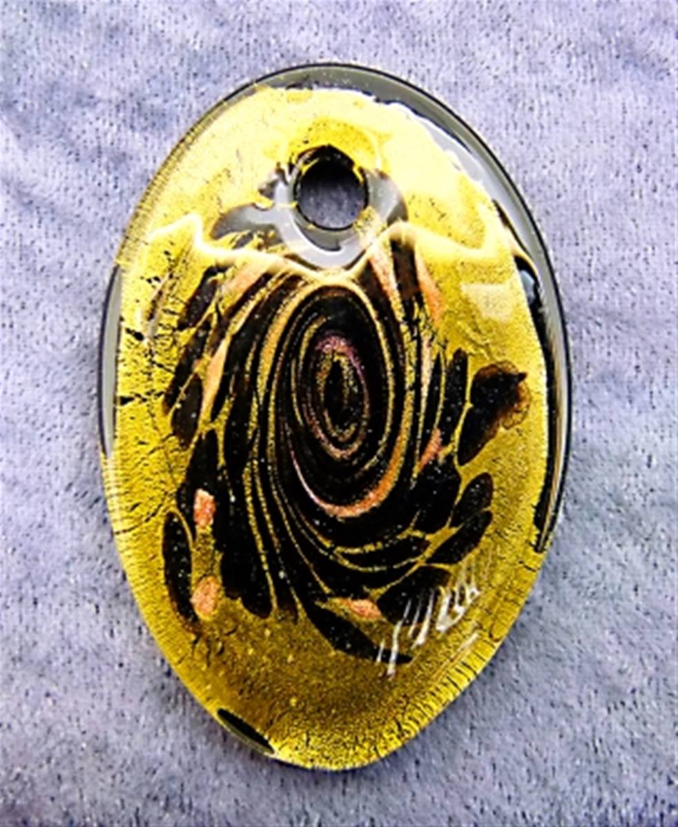 IN GOLD WITH COPPER & BLACK SWIRLS.SIZE = 84MM x 57MM APROx.WEIGHT = 72g.PENDANT SUPPLIED WITH A LENGTH OF BLACK LEATHER CORD.