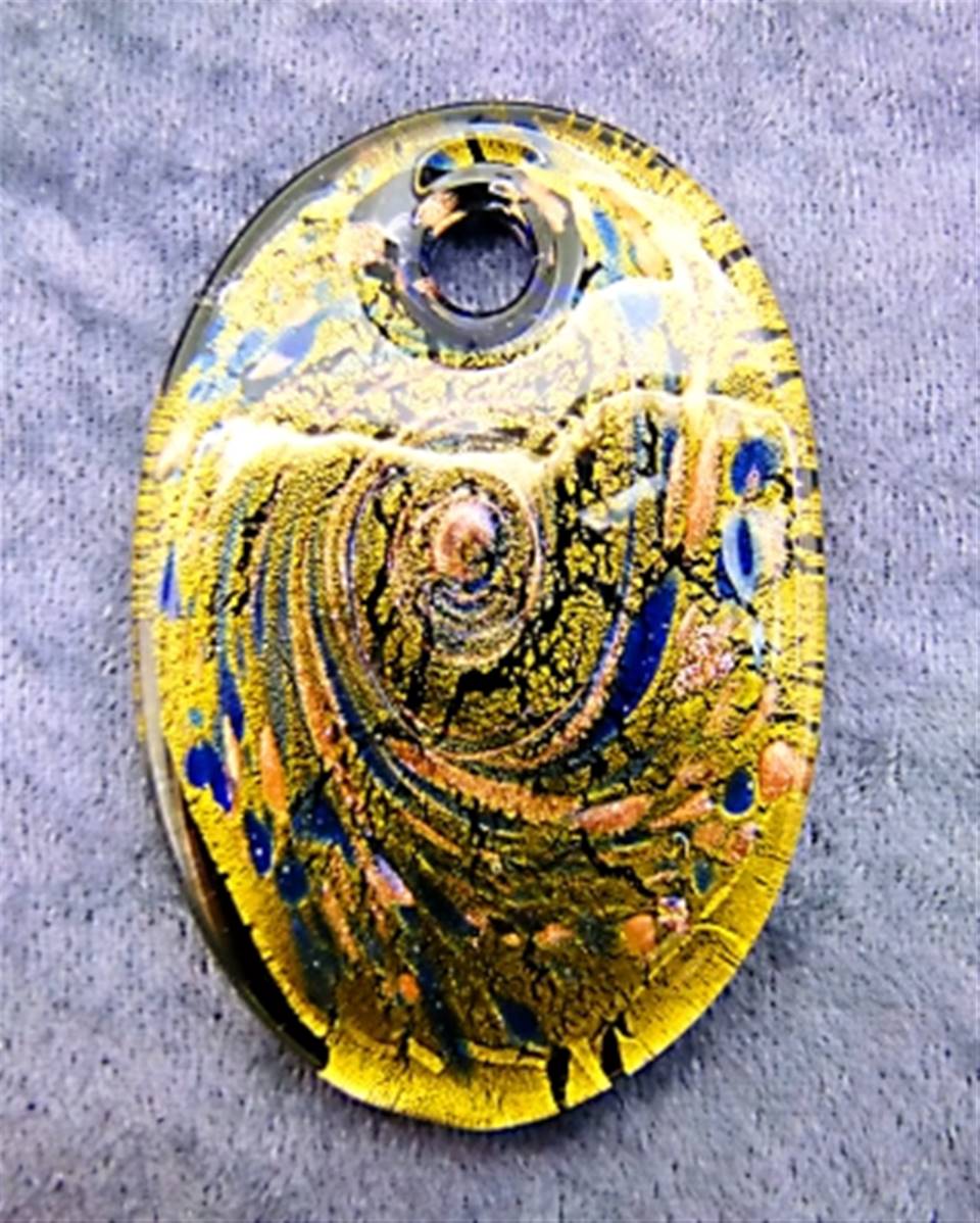 IN GOLD WITH WITH BLACK, BLUE & COPPER SWIRLS.SIZE = 81MM x 55MM APROx.WEIGHT = 67g.PENDANT SUPPLIED WITH A LENGTH OF BLACK LEATHER CORD.