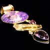 Features a large oval dome polished cabochon in charoite with faceted teardrop shape cabochons in amethyst together with a rough lemurian quartz crystal.size of this pendant = 68mm in length x 33mm wide aprox.WEIGHT = 19g.SIZE Of cabochons = oval charoite-32mm x 24mm, amethyst-12mm x 10mm & 9mm x 6mm.quartz crystal = 26mm x 7mm.