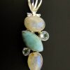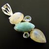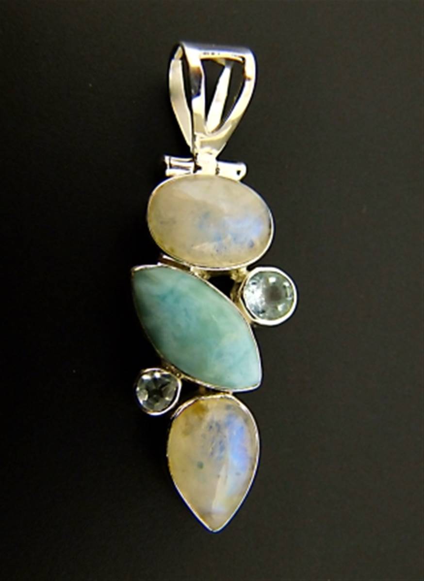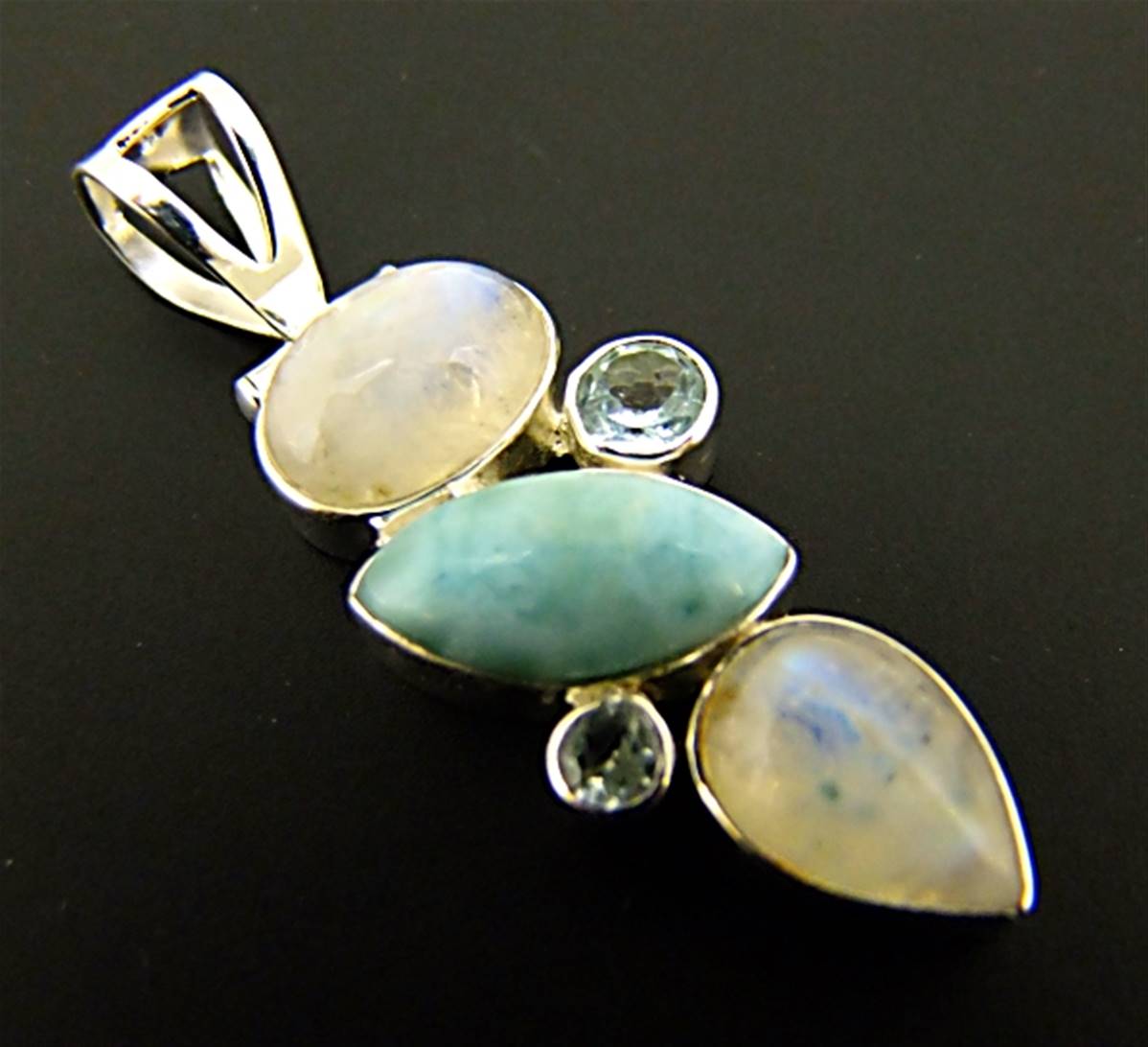 This pendant features dome polished cabochons in moonstone & larimar with smaller facetted cabochons in topaz.size of this pendant = 53mm in length x 19mm wide aprox.WEIGHT = 10g.SIZE Of stones =moonstone oval-14mm x 9mm.moonstone teardrop-14mm x 10mm.larimar-18mm x 9mm.topaz-6mm & 4mm in diameter.