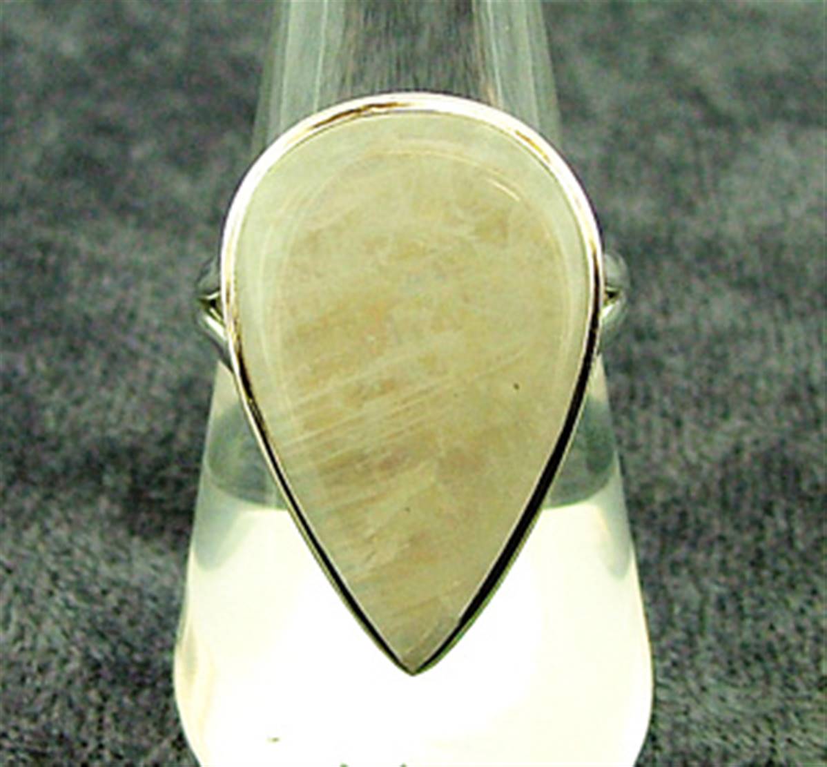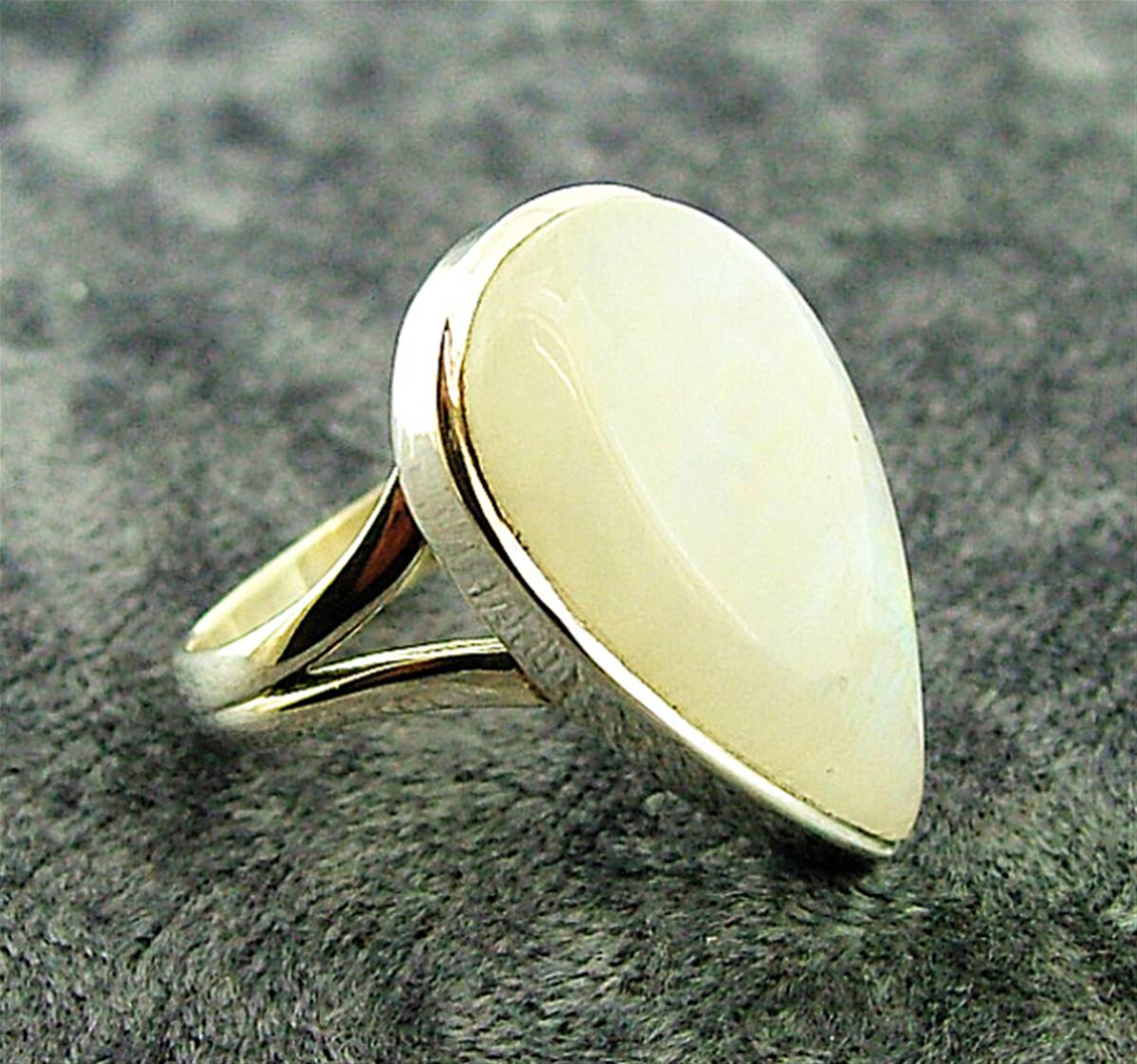 This ring features a single teardrop shape cabochon in rainbow moonstone.ring size = qsize of cabochon = 23mm x 15mmweight = 7g.